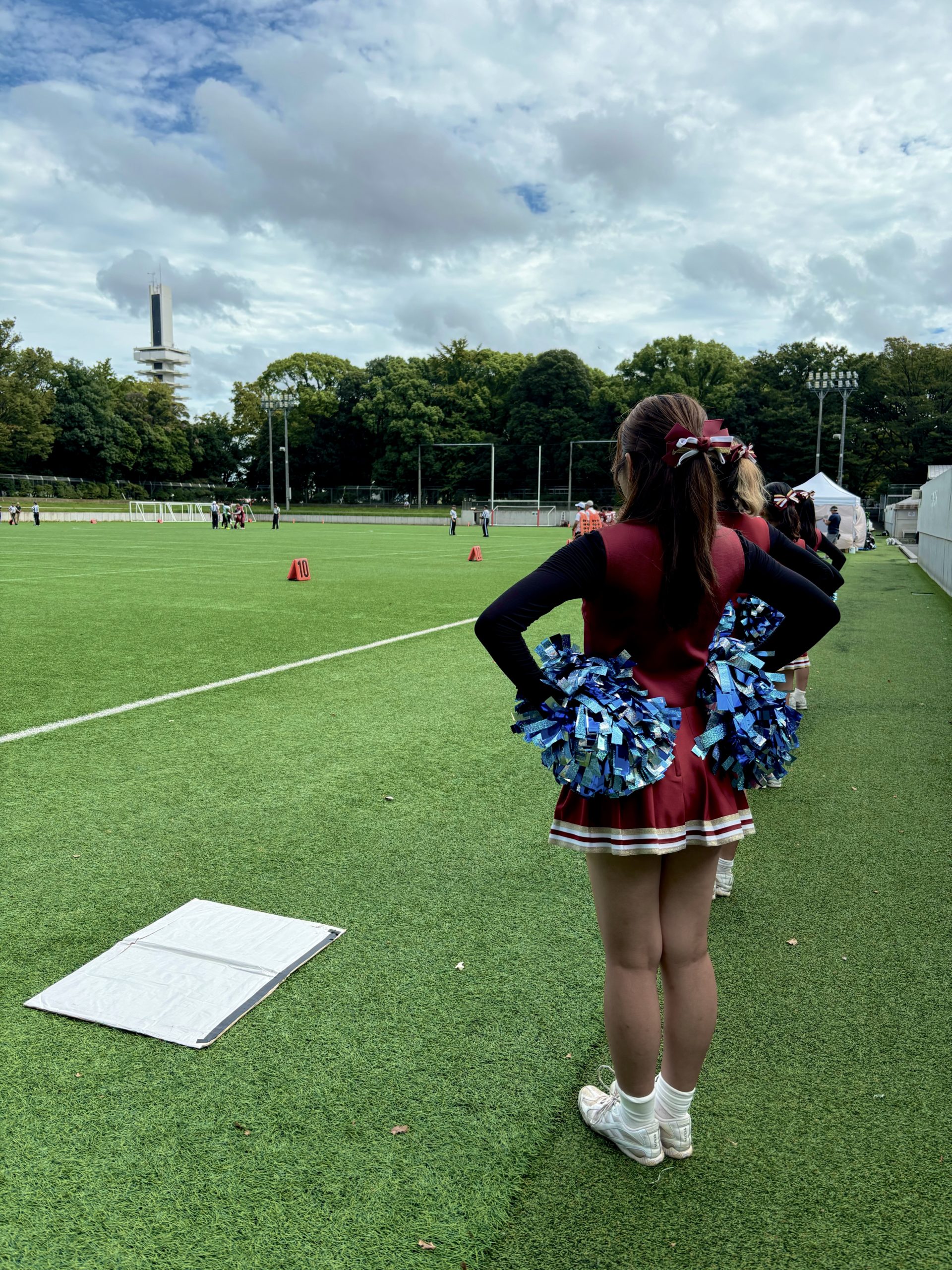 そして攻撃に転じると、#89島倉選手が素晴らしいパスキャッチを見せ大幅にゲインを重ねます。一気にエンドゾーンまで駆け抜けるプレーに、応援にも熱が入りました。第2クォーター残り時間約20秒というタイミングでのタッチダウン成功で、前半を21ー0と大きく差をつけて折り返すことができました。